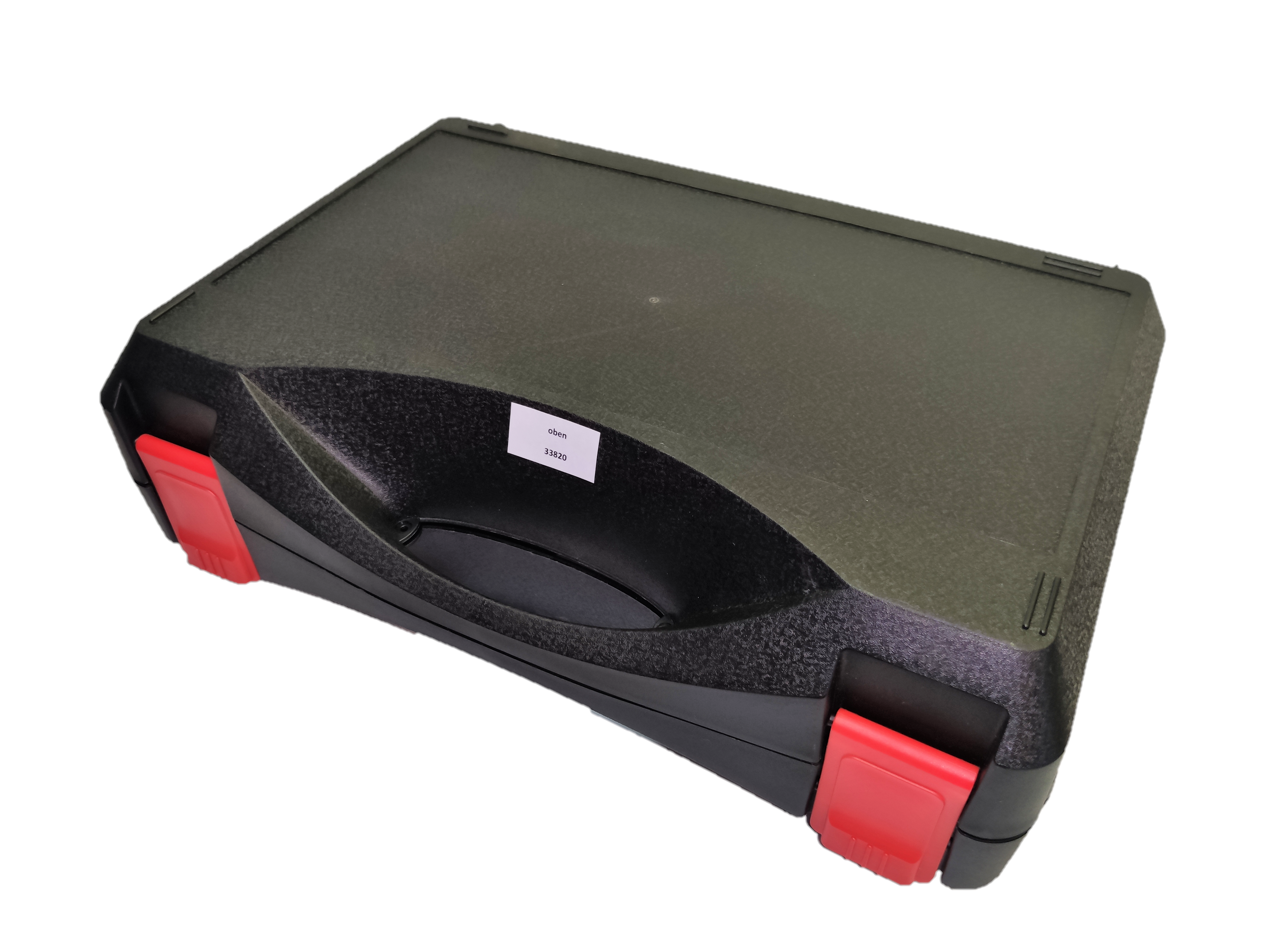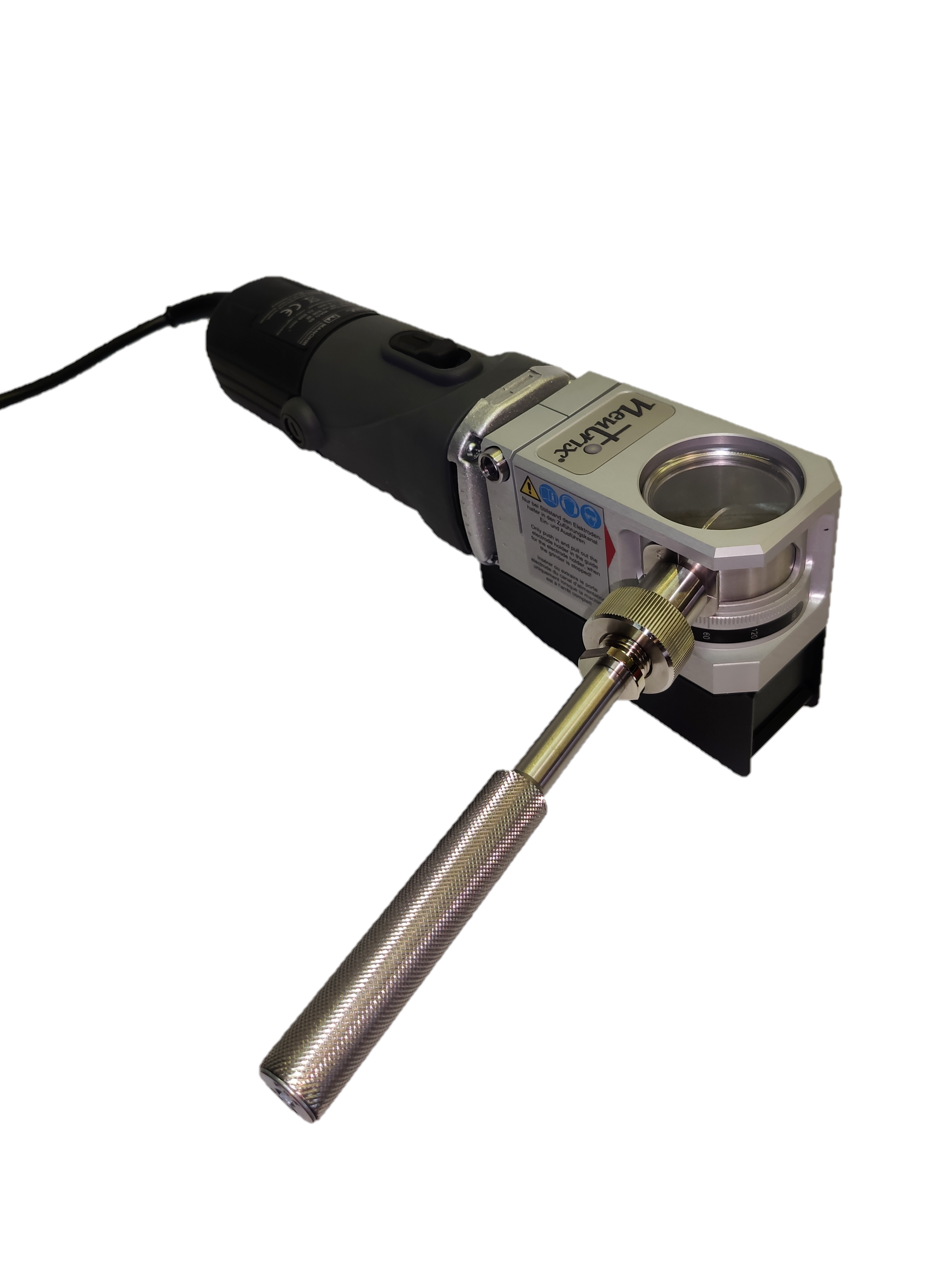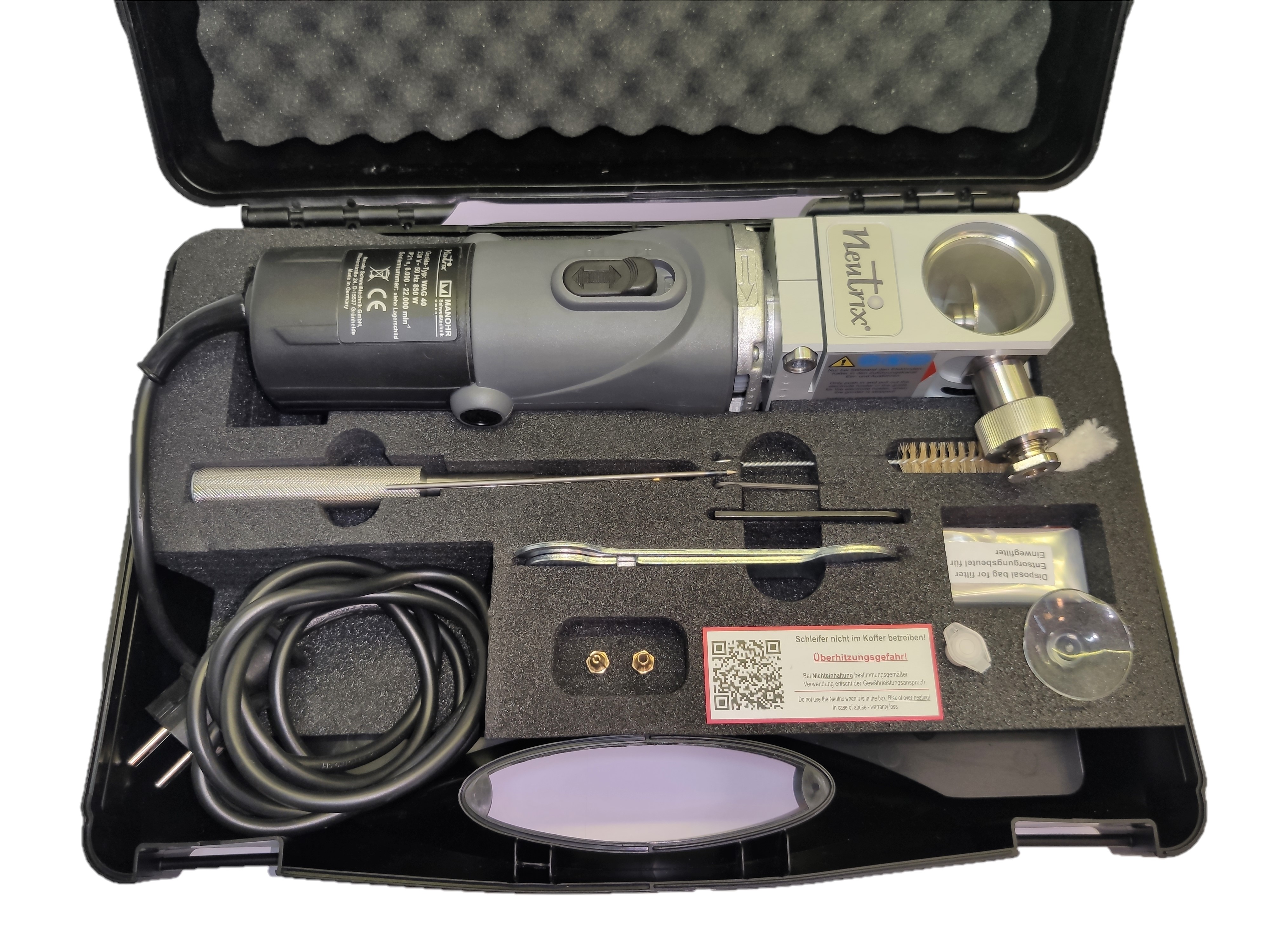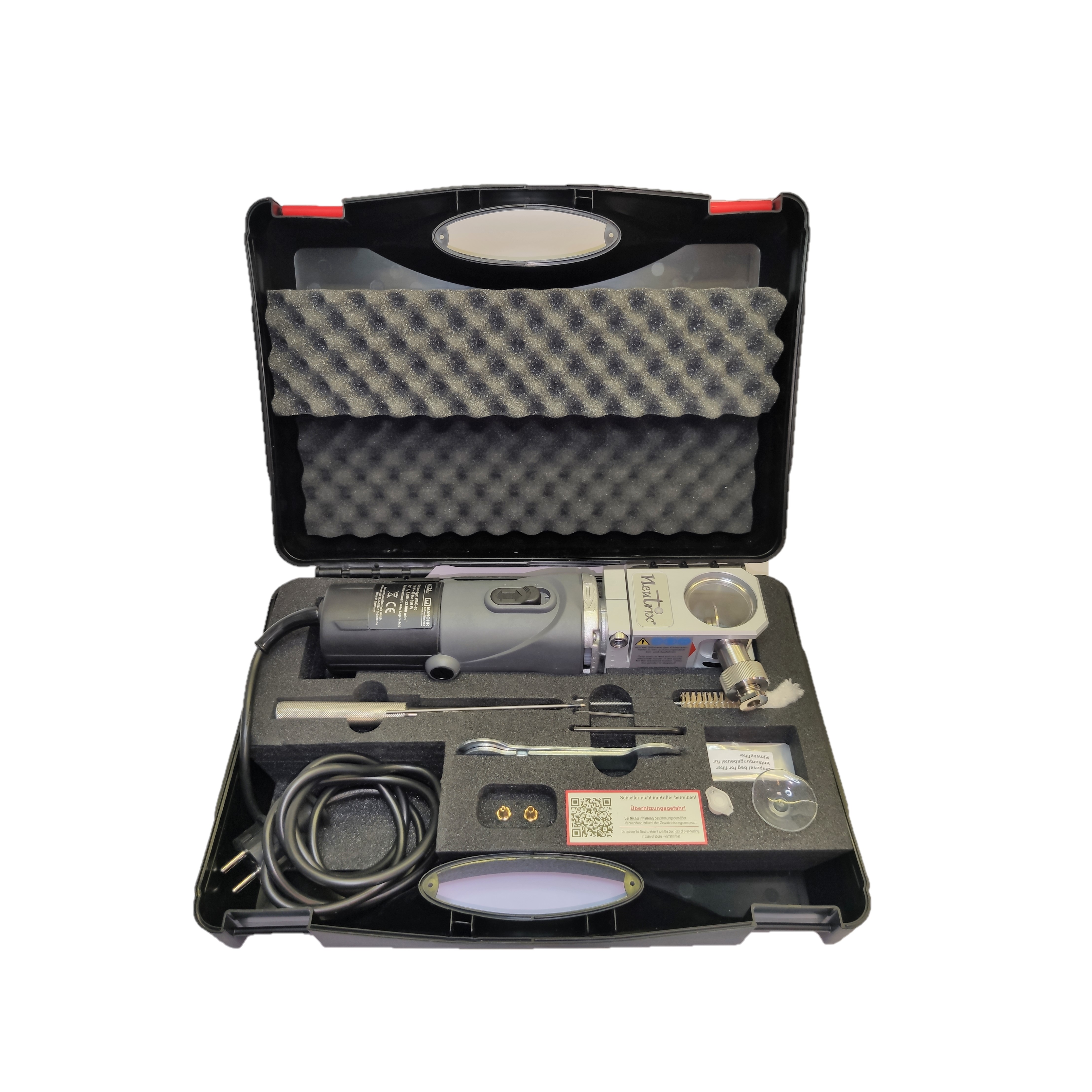 Pārnēsājams volframa elektrodu asinātājs ar transportēšanas koferi.